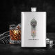 The product is a good size and came exactly as it was pictured. The lid is not attached to the flask, which could be dangerous on drunken nights... The print came out surprisingly well and looks very sharp. Would definitely recommend.