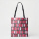 This tote bag has an art deco design made of ovals and half ovals in white and shades of pink on a field of dark grey.
