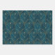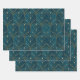 Art Deco pattern with gold geometric shapes on a deep teal background, featuring arch motifs and dotted accents, creating an elegant vintage feel.