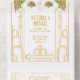 Elegant White and Faux gold foil all in one Wedding invitations that include the wedding info and RSVP postcard that your guests tear off and and send. Envelopes are not needed. These feature deco peacocks and falcons in faux gold foil and other deco elements. Great for a Gatsby, Roaring 20's, Flapper, Prohibition or a elegant Evening Wedding. Matching items on this one!
