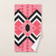 This towel set has an art deco quilt-inspired design of diamond shapes in black, white, and pink on a field of watermelon.