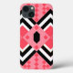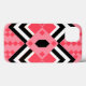 This phone case has an art deco quilt-inspired design of diamond shapes in black, white, and pink on a field of watermelon.