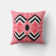 This throw pillow has an art deco quilt-inspired design of diamond shapes in black, white, and pink on a field of watermelon.