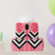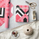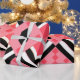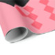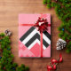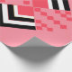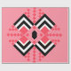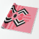 This wrapping paper has an art deco quilt-inspired design of diamond shapes in black, white, and pink on a field of watermelon.