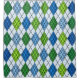This shower curtain has an art deco design of diamond shapes made from overlapping angles in black lines coloured in shades of blue and green with diagonal black lines making the design look like argyle