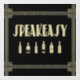 An art deco design wine label that says speakeasy and decorated with liquor bottles. A design that defines the roaring 1920's prohibition. Done in black and gold.