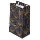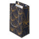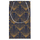 This gift bag has art deco design of diamonds and triangles in gold on a field of blue.