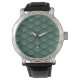 Abstract geometric wavy pattern in Art Deco style on with teal green and copper coloured waves and fan decoration on dark teal green colour background
