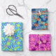 Wrapping paper in an Art Deco pattern based on a traditional, stylized chrysanthemum pattern used in Japanese textiles, in shades of blue, turquoise and lime green, outlined in white, on a silver grey / grey background, shades of blue, turquoise and bright red, outlined in gold, on a dark blue background, and shades of violet, magenta and coral, outlined in gold, on a deep, plum purple background.