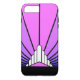 An iconic pattern of the sun rising from behind a stylized art deco shaped building. A simple yet elegant design, true to the era.