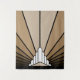 An iconic pattern of the sun rising from behind a stylized art deco shaped building. A simple yet elegant design, true to the era