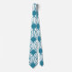 This necktie has an art deco design of diamonds with diagonal lines that look like fans in teal on a field of white.