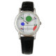 This watch has an art deco stained-glass window design of black lines and red, blue, and green squares and circles.