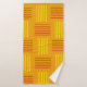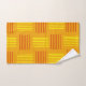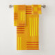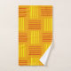 This towel set has an art deco design that looks like a weave in red and yellow on a field of gold.
