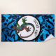 This towel is decorated with a beautiful sparkling multicolor gecko silhouette in a circle. The background is a glitter wavy black and blue pattern reminding water.