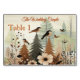 A delightful fantasy art illustration in a modern style depicts a bird family among various tall, light, medium, and dark green pine trees, with a creamy background and flowers.