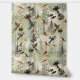 A delightful fantasy art illustration in a modern style depicts a bird family among various tall, light, medium, and dark green pine trees, with a creamy background and flowers.