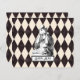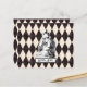 Vintage Alice in Wonderland illustration is Alice putting on a crown ( on front). Background is textured charcoal and ivory harlequin pattern.