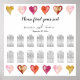 Audrey Jeanne Roberts a peint à la main cet ensemble de coeurs de style art moderne en rose, magenta, rouge, bordeaux avec surligné de peintures métalliques or. Idéal pour un mariage ou un événement de la Saint-Valentin avec des places assises pouvant accueillir jusqu'à 14 tables. Vous pouvez supprimer un tableau en effaçant simplement le texte dans sa zone de modèle. Art et design, copyright, Audrey Jeanne Roberts.