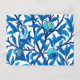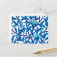 Postcard in a William Morris Art Nouveau tapestry pattern of exotic birds in a pomegranate tree, with cobalt and cerulean blue leaves, birds and fruit in blue and turquoise, and a white background