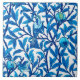 Tile in a William Morris Art Nouveau tapestry pattern of exotic birds in a pomegranate tree, with cobalt and cerulean blue leaves, birds and fruit in blue and turquoise, and a white background