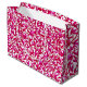 Large gift bag in a William Morris Art Nouveau tapestry pattern of exotic birds in a pomegranate tree, with fuchsia pink and violet leaves, birds and fruit in fuchsia and orchid pink on a white background