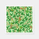 Paper napkins in a William Morris Art Nouveau tapestry pattern of exotic birds in a pomegranate tree, with emerald green leaves, birds and fruit in lime green and deep ruby red, and a pastel lime green background