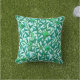 Pillow in a William Morris Art Nouveau tapestry pattern of exotic birds in a pomegranate tree, with turquoise blue and teal leaves, jade green branches, birds and fruit in jade green aqua, and a pale aqua background