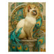 A majestic cat with lush, detailed fur sits gracefully among an ornate arrangement of flowers and swirling vines, all framed within an intricate Art Nouveau-style design. The cat gazes upward with serene wisdom, bathed in soft golden light, while the background blooms with rich pastel and earth tones, creating a sense of timeless beauty and natural elegance.