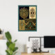 A collage of artistic, art nouveau prints by Christopher dresser. A mixture of arts and craft style , Victorian and art nouveau textile prints. Bold and elegant. In colours of black, gold and green.
