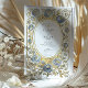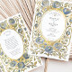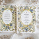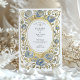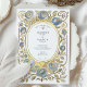 Introduce your wedding with unforgettable elegance using this stunning Art Nouveau-inspired invitation. This design features a sophisticated watercolor illustration of stylized roses in beautiful shades of dusty and slate blue, each accented with a touch of antique gold. The unique blue florals are intertwined with soft sage green leaves and flowing vines, creating a luxurious and artistic border. An ornate, textured gold oval frame encloses your wedding details, which are set in a timeless combination of serif and script fonts. This invitation is perfect for the couple seeking a unique, artful, and supremely elegant aesthetic for their vintage, formal, or autumn wedding.