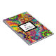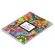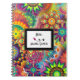 A burst of art deco flower shapes and spinning wheels in many vibrant and exciting colours. Many different shapes and patterns with petals and circles and more overlap in this art nouveau ornamental styled pattern. A variety of bright and bold colours gives this pattern excitement and fun which is bursting with life. The dominant colours are vivid lime green, sunburst orange, turquoise blue, tangerine and burgundy red. A black bordered frame is placed in the centre with text which says Notes and your customized name in an art deco font (you can customize it to say whatever you like) and a long stemmed red rose illustration in the centre.