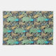 Art nouveau pattern based on a vintage William Morris tapestry inspired fabric depicting a forest scene with peacocks, hares and foxes, digitally rendered in turquoise, greens, browns and a black background for the look of a traditional tapestry
