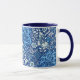 Art Nouveau, fantasy underwater floral pattern mug of graceful seaweed, leaves and flowers, based on a vintage William Morris textile design, digitally enhanced and coloured in white and light sky blue on a deep cobalt blue background
