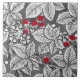 Ceramic tile in an Art Nouveau pattern of strawberry plants, with leaves, flowers and berries, based on a vintage William Morris textile design, digitally enhanced and colored in black and white, with a dark graphite gray /grey background, and an accent of deep red berries