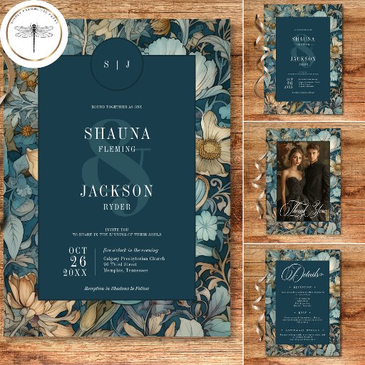 Indulge in the enchantment of the past with our vintage floral wedding invitations. Inspired by the iconic designs of William Morris, these invitations feature a mesmerizing blend of vintage hues - deep teal blues, soft tans, golds, and creams. The intricate floral patterns, reminiscent of the Art Nouveau era, exude a touch of darkness, adding a mysterious allure to your special day. The dark teal text area, adorned with elegant vintage script, provides a striking contrast against the rich floral backdrop. This timeless design captures the essence of classic romance, making it the perfect choice for couples seeking a truly unique and unforgettable invitation. Created by Simply Farmhouse Press.