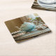This coaster features a digital photograph of a hand-painted Art Nouveau teapot in azure blue with floral designs winding around its curved body. The teapot sits on a round wooden table showcasing its elegant form and ornate handle. Around the teapot are scattered antique porcelain dishes holding sugared almonds, a stack of linen napkins tied with a silk ribbon and a single, faded rose in a tiny glass vase. The coaster is a square paper pulp coaster. The coaster set contains six coasters.