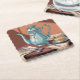 This coaster features an Art Nouveau illustration of a porcelain teapot painted in a delicate shade of sky blue. The teapot is prominently positioned on a circular mahogany table. The teapot features ornate floral patterns in silver leaf, a gracefully curved spout and a matching lid adorned with a sculpted rose. Around the teapot are scattered antique silver cutlery, a stack of cream-coloured linen napkins and a half-eaten lemon tart, all softly illuminated against a warm terracotta background, evoking a sense of quiet elegance and refined taste. The coaster is a scalloped square paper pulp coaster. There are six coasters in the coaster set.