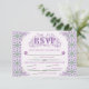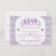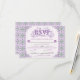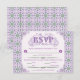 An elaborately detailed Art Nouveau response card with an elegant decorative font, bordered by intricate tiles of lilac and lavender thistle. A pairing of elegant fonts has been carefully selected to accompany the decorative floral announcement text, however, they can be changed to meet your needs. You can also change their wording and colors, as well as the color of the RSVP text, and hide any unnecessary choices in the editing panel.
