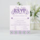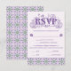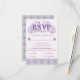 An elaborately detailed Art Nouveau response card with an elegant decorative font, bordered by intricate tiles of lilac and lavender thistle. A pairing of elegant fonts has been carefully selected to accompany the decorative floral announcement text, however, they can be changed to meet your needs. You can also change their wording and colors, as well as the color of the RSVP text, and hide any unnecessary choices in the editing panel.