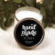 Ces étiquettes d'emballage de petite entreprise en mode boho noir présentent une typographie rétro blanche, sur un arrière - plan noir foncé. Le texte dit "fait main", et il y a de la place pour votre nom ou votre nom de société, et le nom de votre produit. Un look à la fois professionnel et élégant, parfait pour n'importe quel type de produit, comme les bougies, les vêtements, l'artisanat et la céramique.