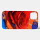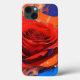 Artistic phone case features modern AI generated digital abstract marbled red and orange rose in full bloom on blue background.