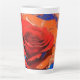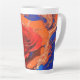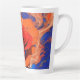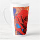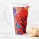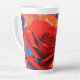 Artistic tall latte mug features modern AI generated digital abstract marbled red and orange rose in full bloom on blue background.