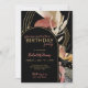 A stylish birthday party invitation for her that is a mini work of art featuring modern abstract painted shapes in earthy tones of terracotta, beige, gold, grey and tan over a chic black background. A trendy arched frame offset to the left surrounds the text template to personalize with your party details. Wow your invited guests with this chic and artful invitation.