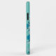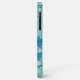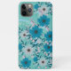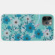 A phone case with a floral pattern on a light blue background. The pattern consists of blue and white flowers with dark centres, along with green leaves and small pink berries. The flowers are arranged in a dense, overlapping manner, creating a rich and textured design. The phone case has a glossy finish, and the camera lenses are visible at the top left corner. The overall style is feminine and decorative, with a focus on natural elements. The colour palette is soft and calming, with a balance of cool and warm tones.