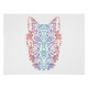 An artistic line drawing of a wolf's face in blue, turquoise and red gradient colors.