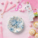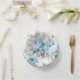 This delicate artistic design features pale dusty blue roses, wildflowers and hydrangea blossoms with light pastel sage foliage on eggshell background.