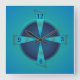 A simplistic artistic clock in sea green with deep blue round center.A striking design with numerals to match,A great special occasion gift.