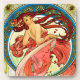 1898 Art Nouveau lithograph poster by Czech artist, Alphonse Mucha (1860-1939). Beautiful woman in a red dress, flowers in her long, flowing, bright red hair, her back arched, looking over bared shoulders, standing on her toes.