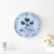 Here's a trio of blue wine glasses a la artsy fartsy watercolor style background in more blue on this gourmet kitchen clock personalized with your name or other text.